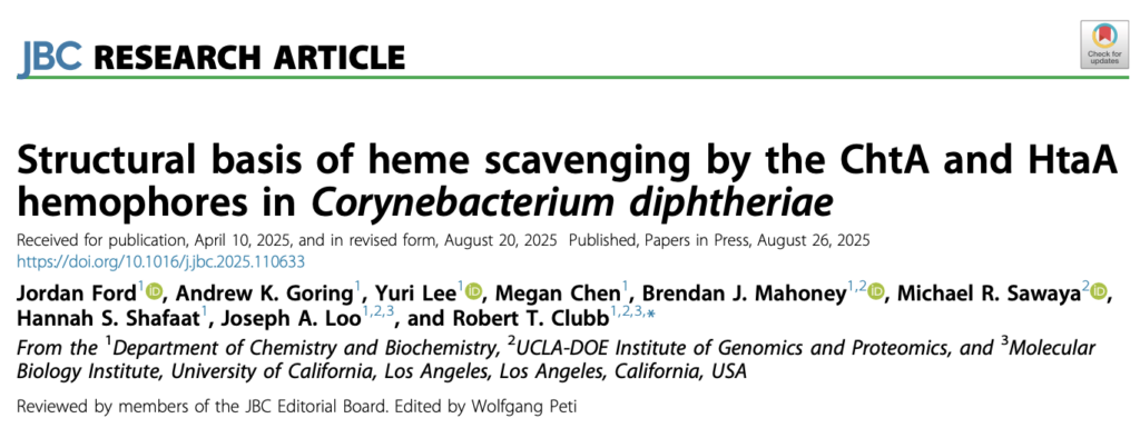 54. Ford, J.; Goring, A. K.; Lee, Y.; Chen, M.; Mahoney, B. J.; Sawaya, M. R.; Shafaat, H. S.; Loo, J. A.; Clubb, R. T. Structural basis of heme scavenging by the ChtA and HtaA homophones in Corynebacterium diphtheriae. Journal of Biological Chemistry. 2025. [Link]