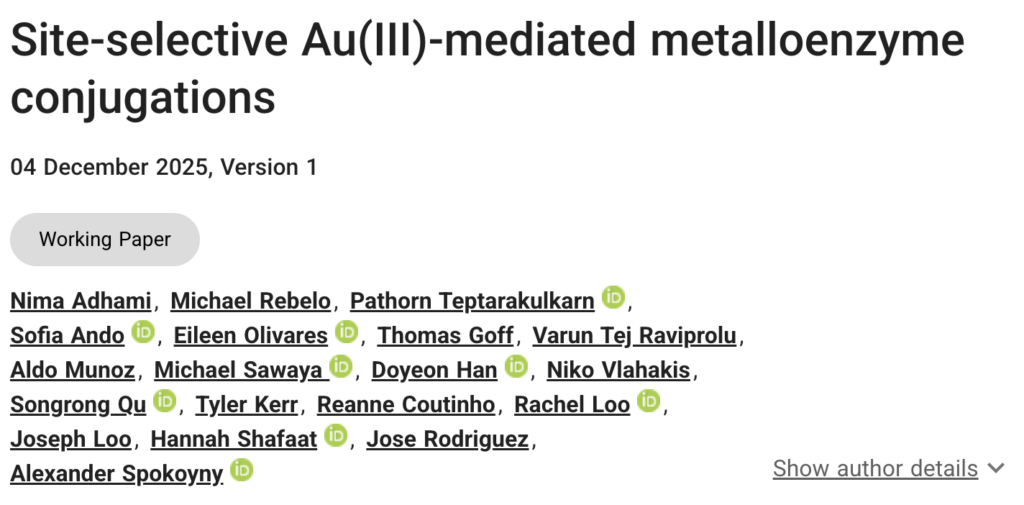 56. Adhami, N.; Rebelo, M.; Teptarakulkarn, P.; Ando, S.; Olivares, E.; Goff, T.; Raviprolu, V. T.; Munoz, A.; Sawaya, M.; Han, D.; Vlahakis, N.; Qu, S.; Kerr, T.; Coutinho, R.; Loo, R.; Loo, J.; Shafaat, H.; Rodriguez, J.; Spokoyny, A. Site-selective Au(III)-mediated metalloenzyme conjugations. ChemRxiv. 2025. [Link]