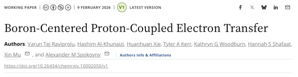 59. Raviprolu, V. T.; Al-Khunaizi, H.; Xie, H.; Kerr, T. A.; Woodburn, K. G.; Shafaat, H. S.; Mu, X.; Spokoyny, A. M. Boron-Centered Proton-Coupled Electron Transfer. ChemRxiv. 2026. DOI: 10.26434/chemrxiv.10002050/v1. [Link]